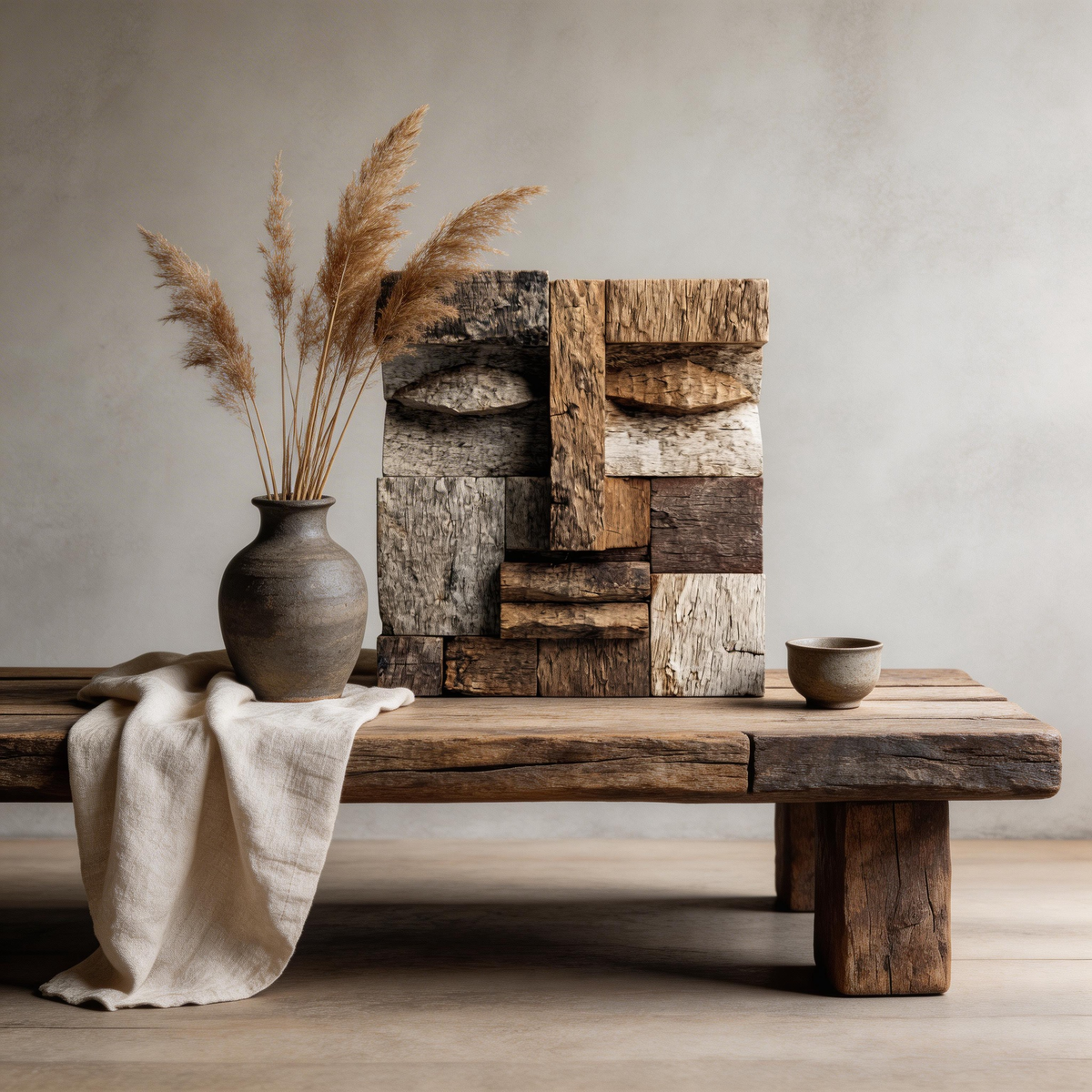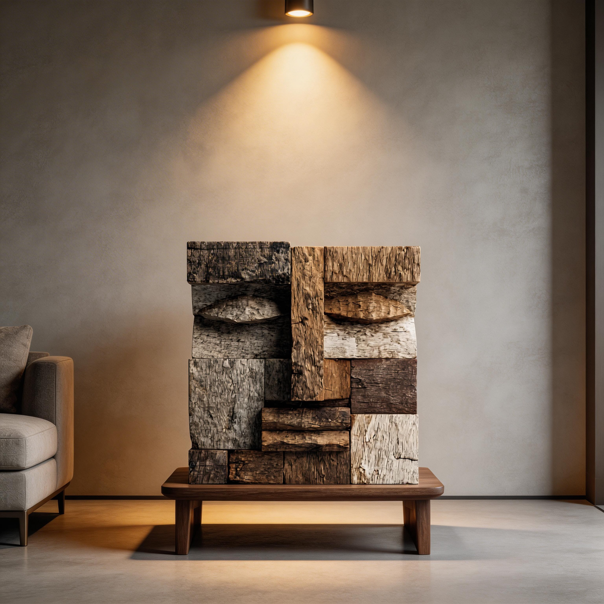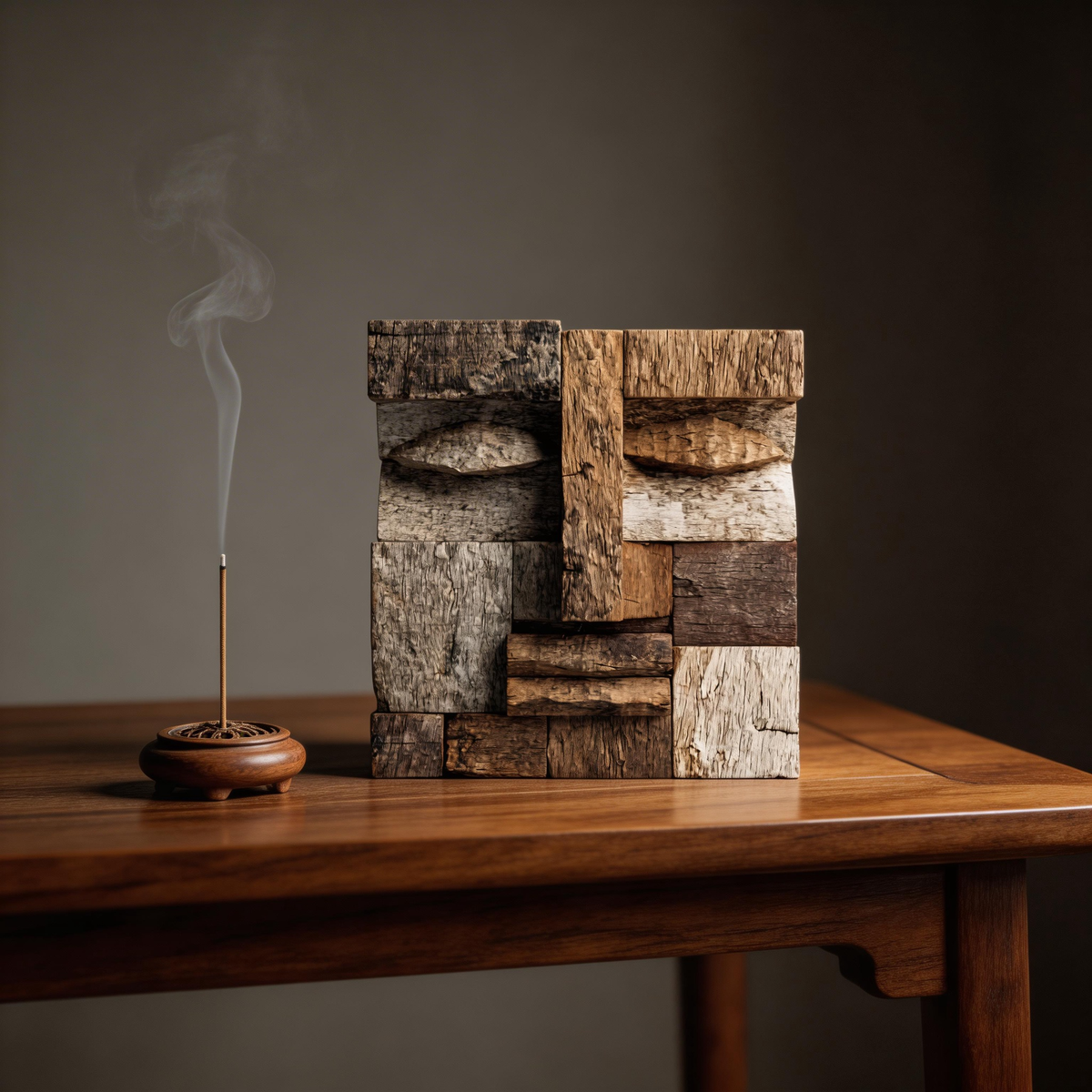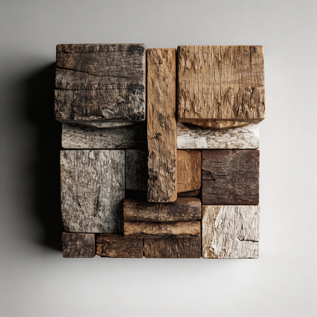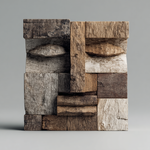 A striking abstract sculpture crafted from reclaimed weathered wood, featuring a geometric block-stacked composition that forms a stoic, primitive face. The mix of deep browns, weathered grays, and pale whitewashed planks reveals natural wood grain, cracks, and textures, evoking themes of time, heritage, and the raw beauty of repurposed materials. A bold centerpiece that bridges rustic wabi-sabi aesthetics and modern cubist design, ideal for industrial, minimalist, or zen-inspired interiors.-
