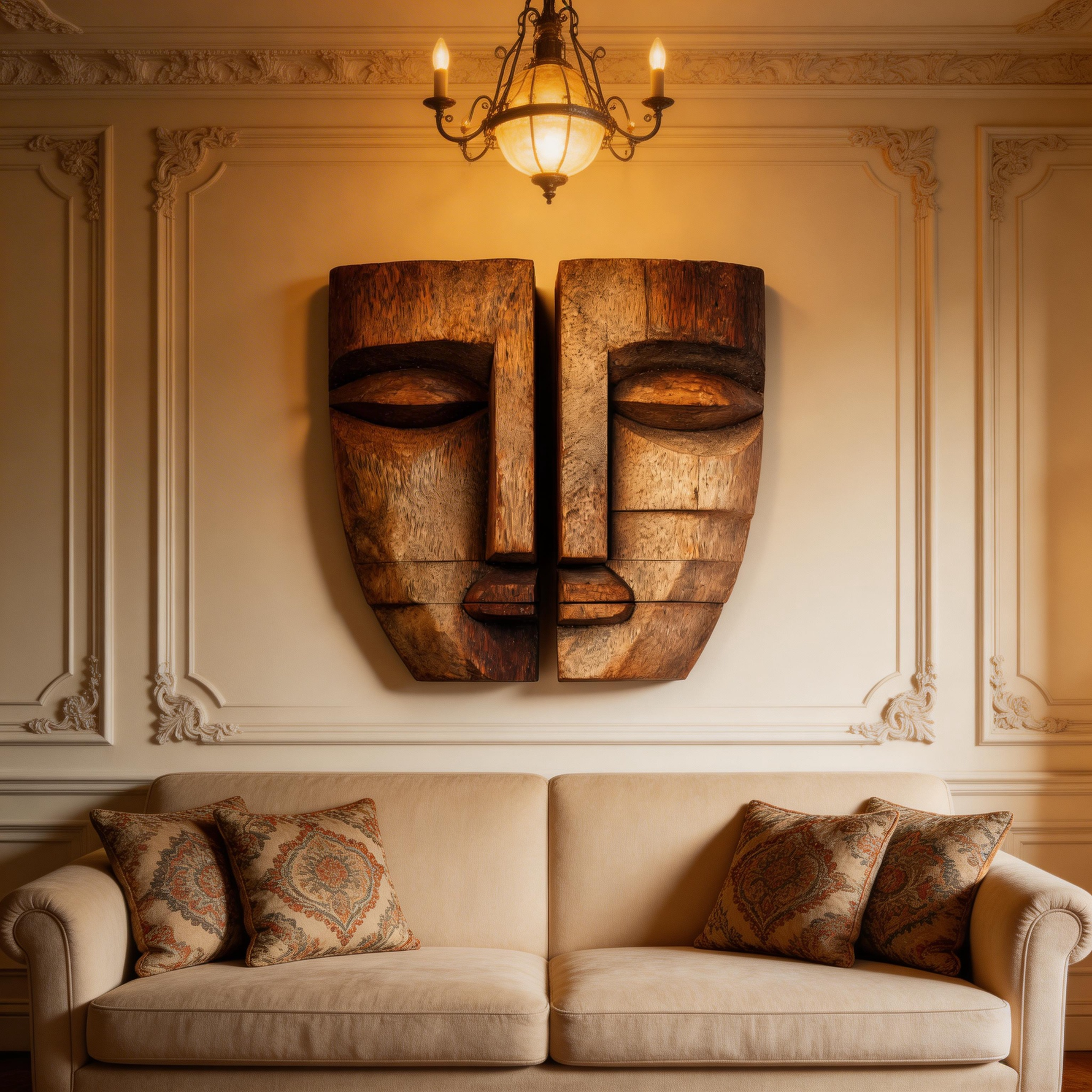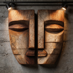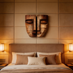 A pair of hand-carved reclaimed wood wall masks, forming a symmetrical abstract face with geometric, blocky facial features. The natural wood grain and textured finish blend tribal artistry with modernist minimalism. Ideal as a striking decorative accent for contemporary, bohemian, or minimalist interiors.-