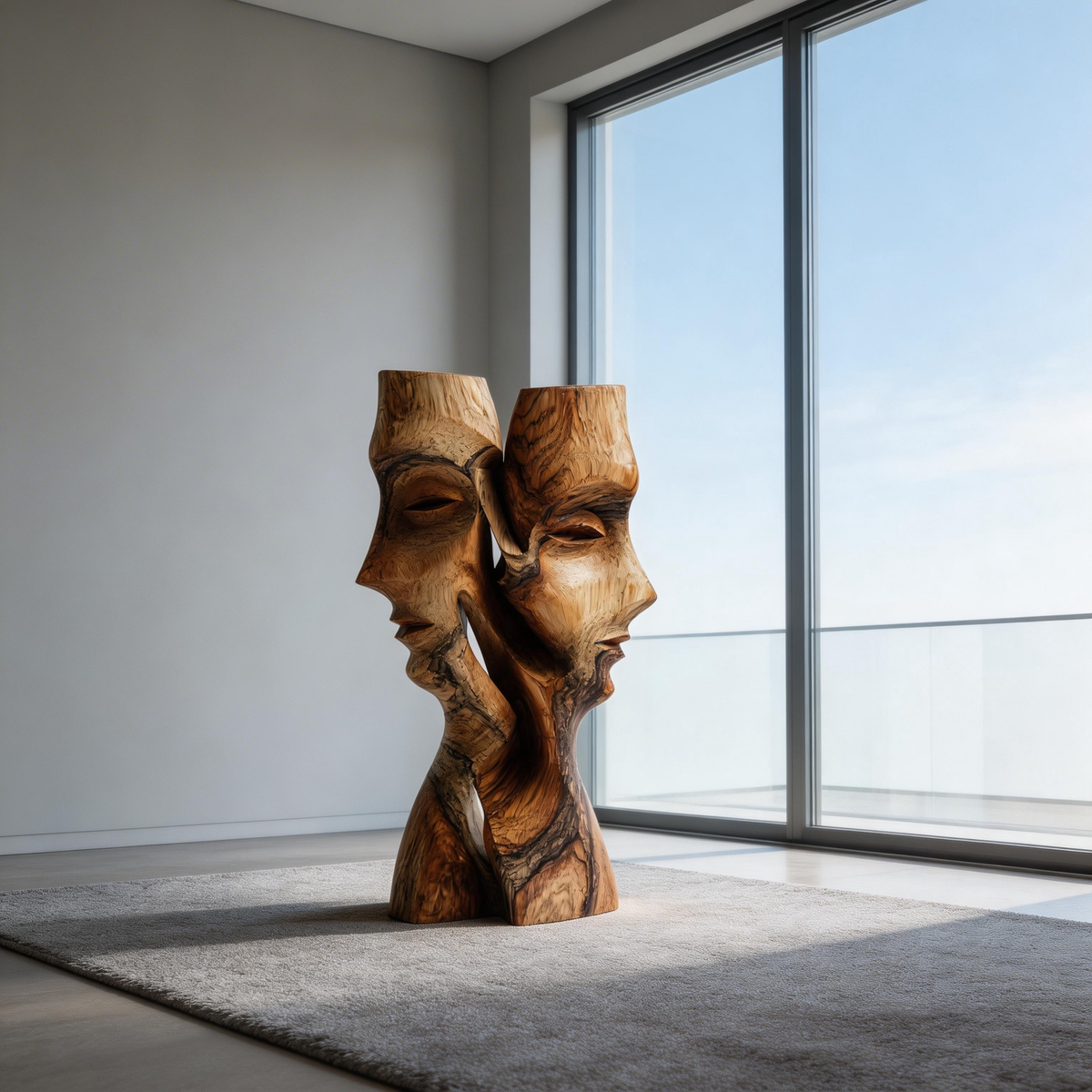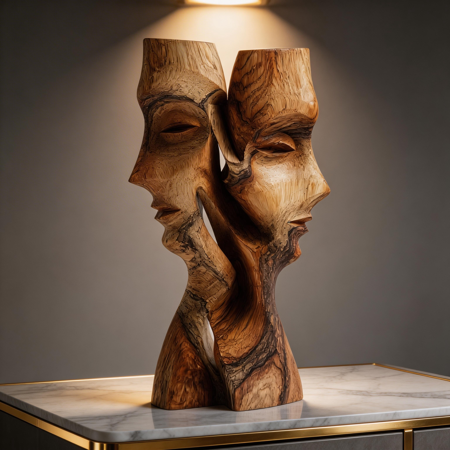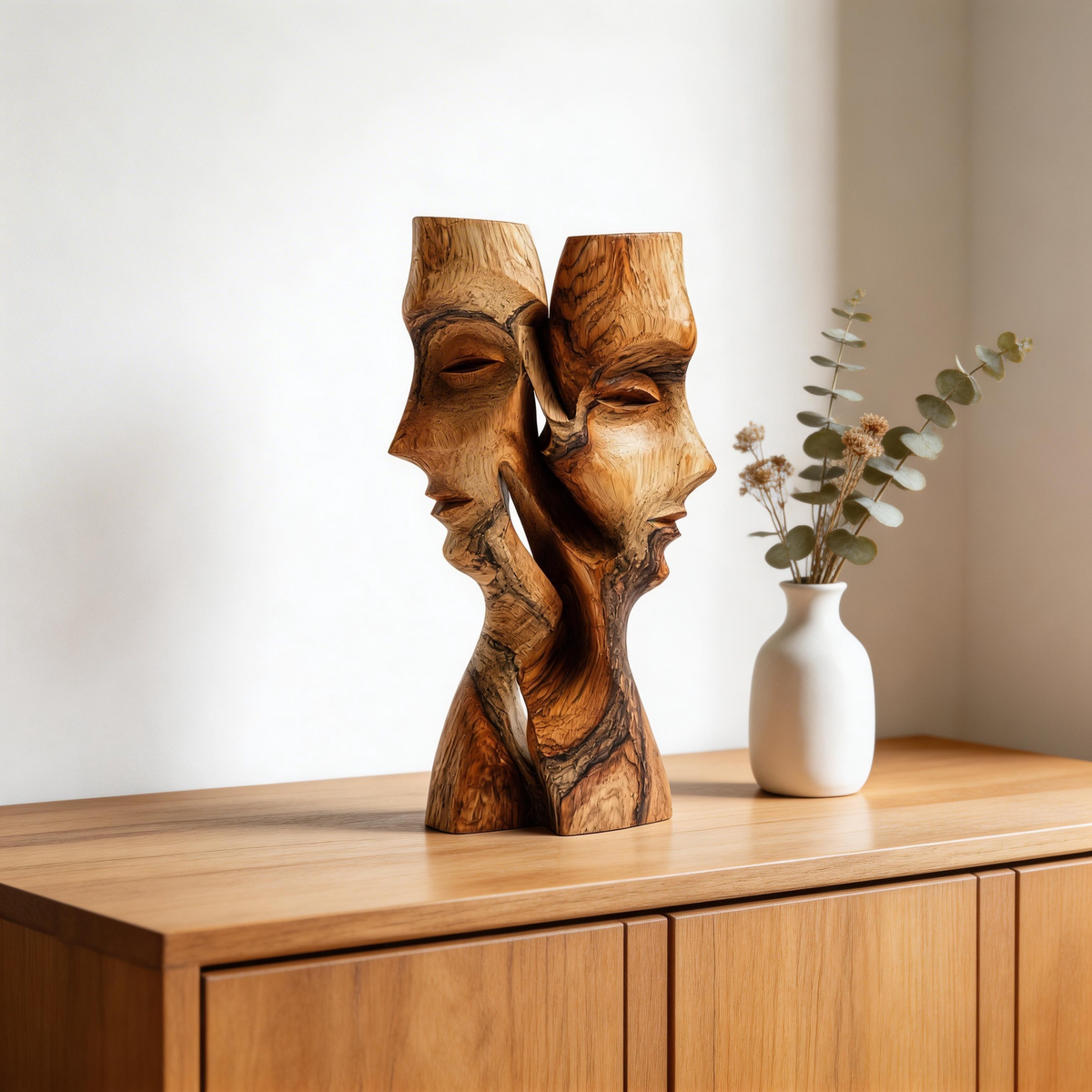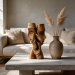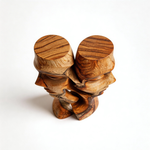 A hand-carved abstract sculpture from solid hardwood, depicting two intertwined faces in a fluid, intimate embrace that evokes quiet conversation. The natural wood grain and flowing contours highlight the material’s warmth, while the seamless connection between forms speaks to trust and connection. Each piece is hand-finished to preserve the wood’s unique texture, making it a timeless centerpiece for modern or traditional interiors.-