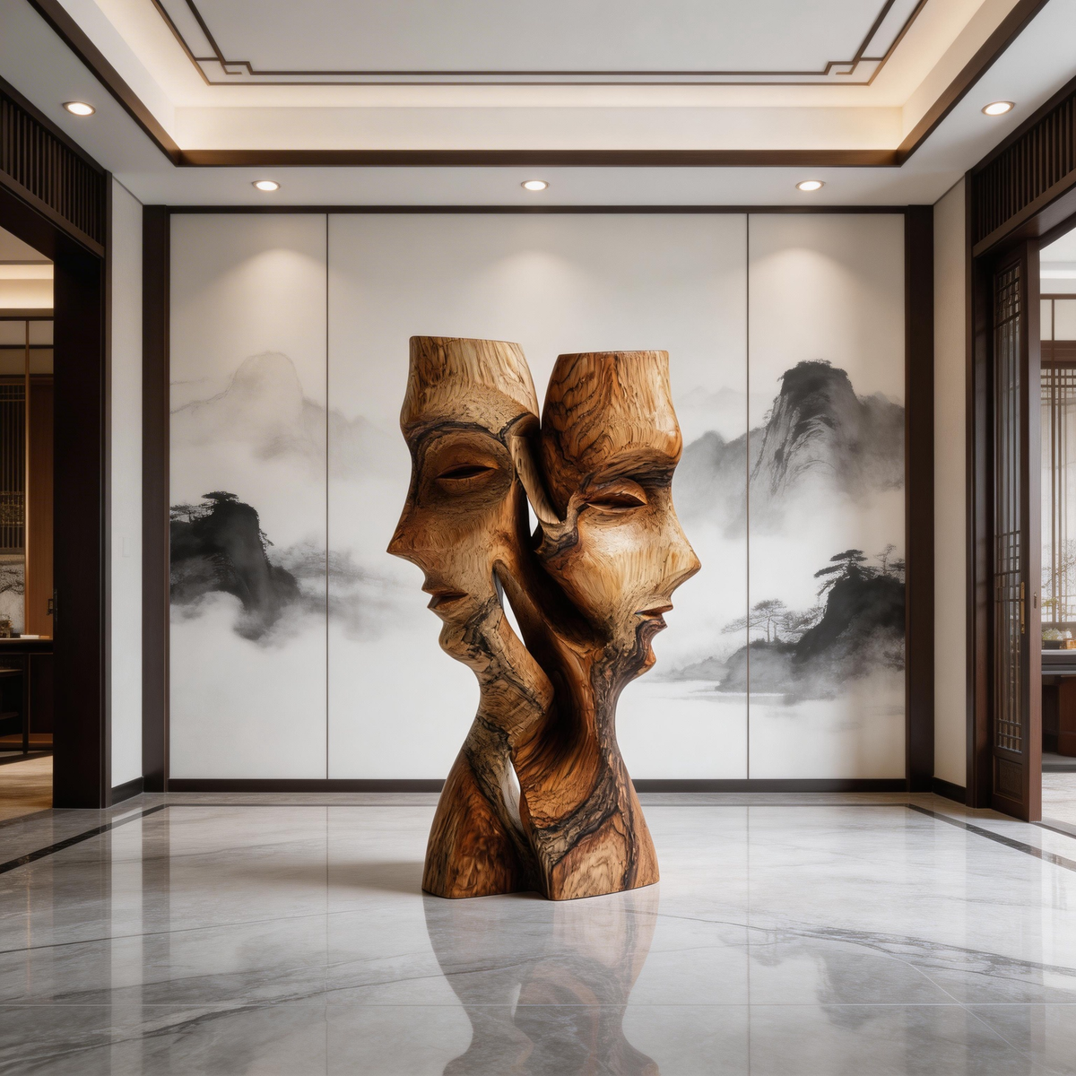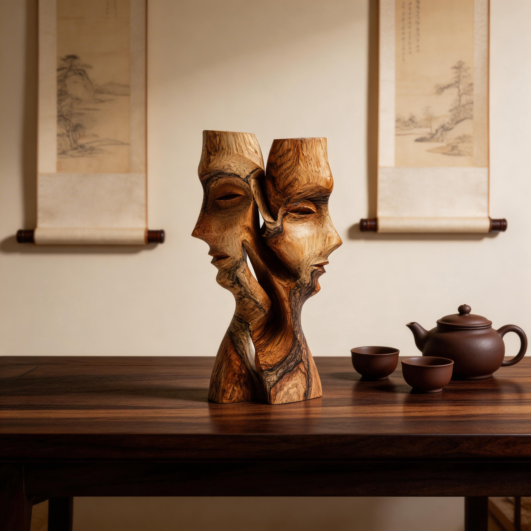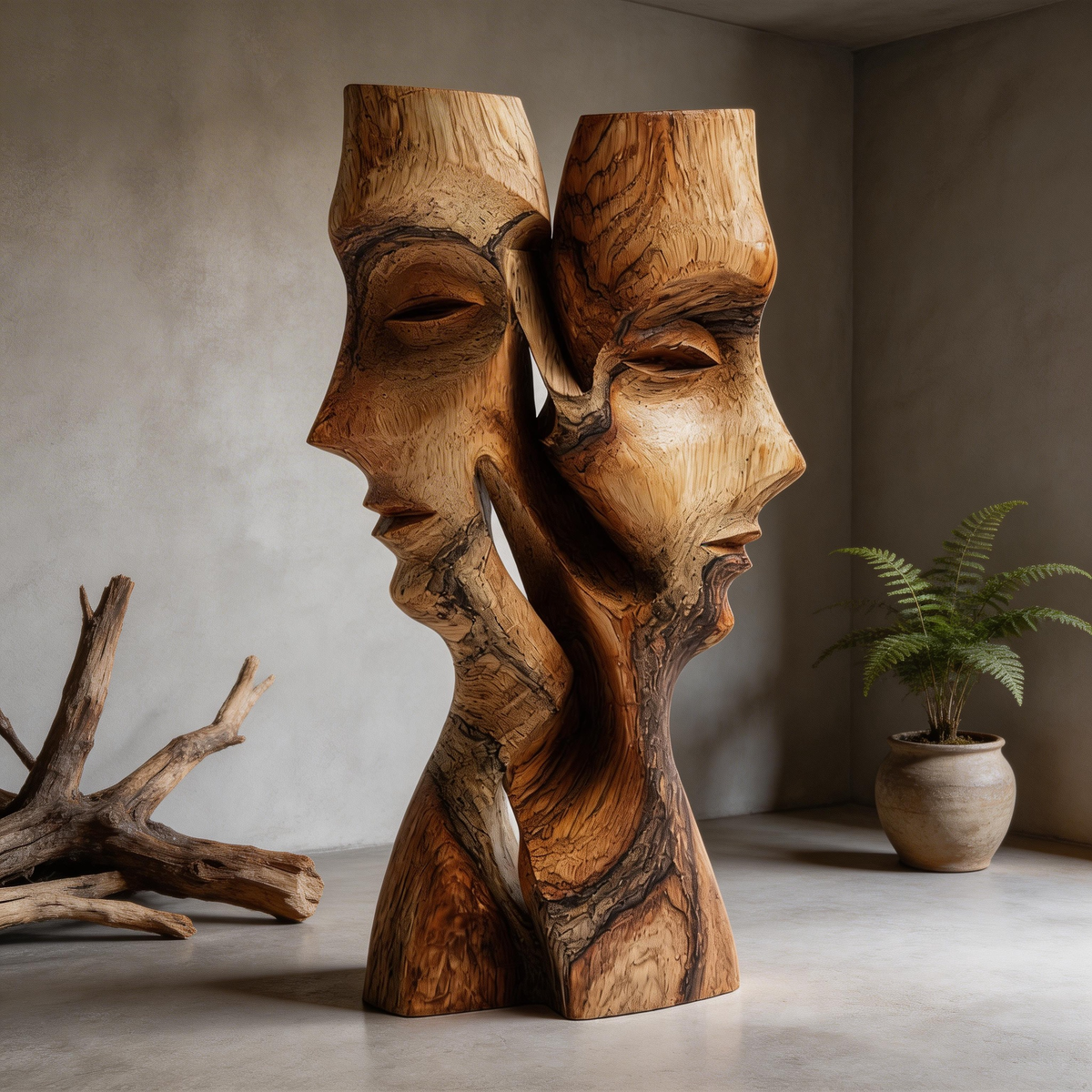 A hand-carved abstract sculpture from solid hardwood, depicting two intertwined faces in a fluid, intimate embrace that evokes quiet conversation. The natural wood grain and flowing contours highlight the material’s warmth, while the seamless connection between forms speaks to trust and connection. Each piece is hand-finished to preserve the wood’s unique texture, making it a timeless centerpiece for modern or traditional interiors.-