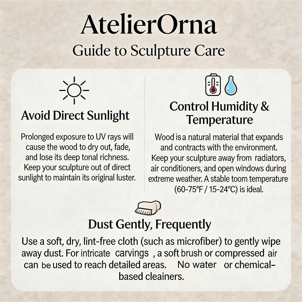 Each sculpture in our collection is a masterpiece carved with passion and precision. To ensure your wooden art retains its timeless beauty and structural integrity for generations, proper care is essential. Unlike mass-produced decor, our hand-carved pieces are living works of art that respond to their environment. With these simple guidelines, you can preserve the rich texture and vibrant grain of your sculpture.