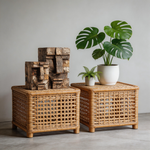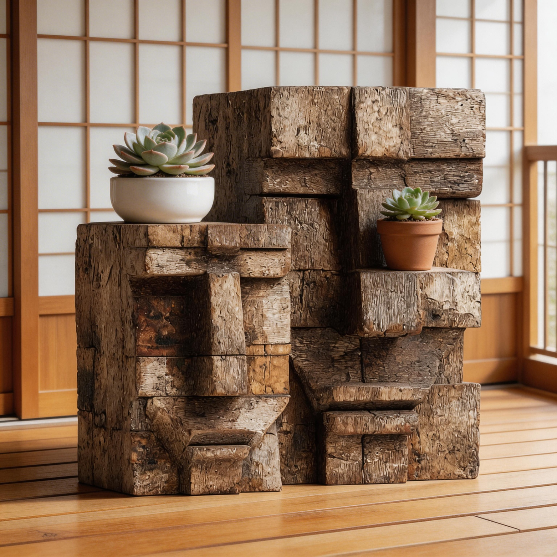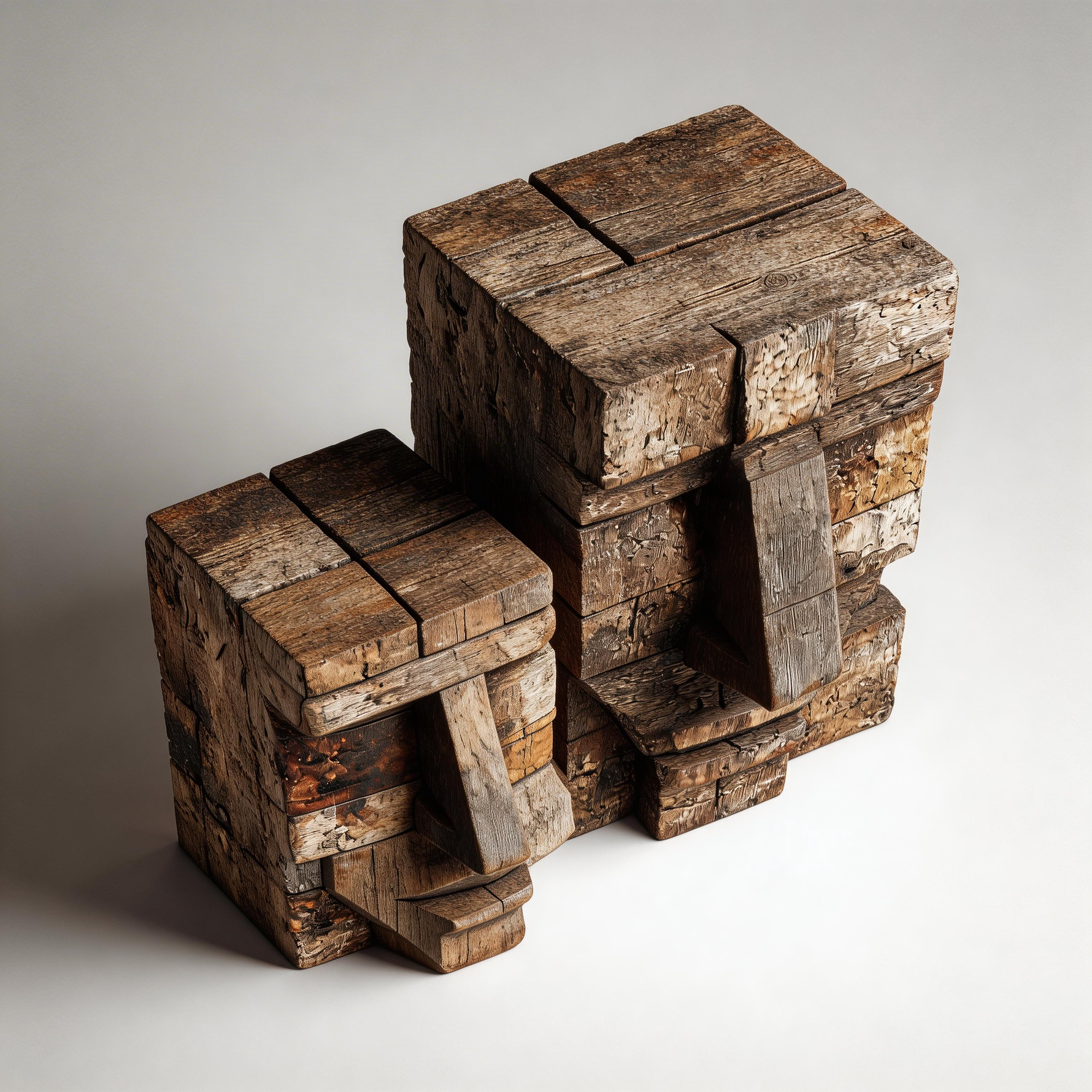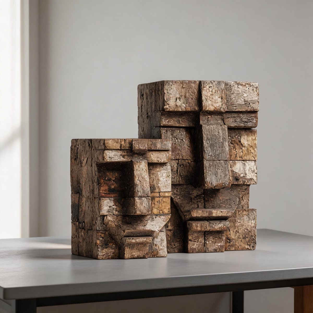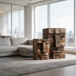 A set of two hand-carved reclaimed wood block sculptures, each forming a distinct primitive geometric face. The stacked weathered planks reveal natural grain, earthy tonal variations, and minimalist cubist design, evoking themes of heritage, community, and the raw beauty of repurposed materials. Ideal as a cohesive decorative pair for rustic, industrial, or zen-inspired interiors.-