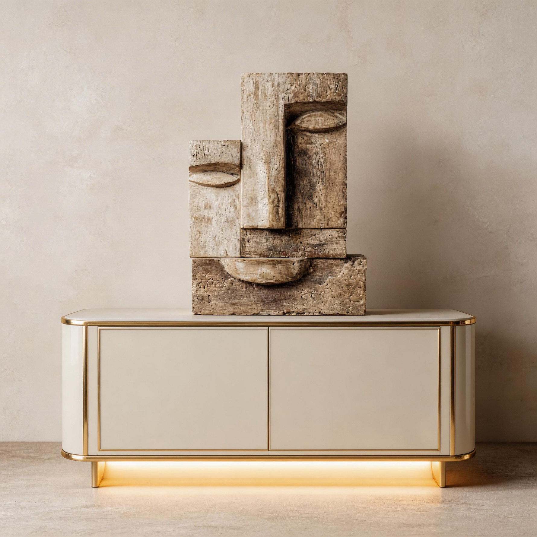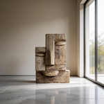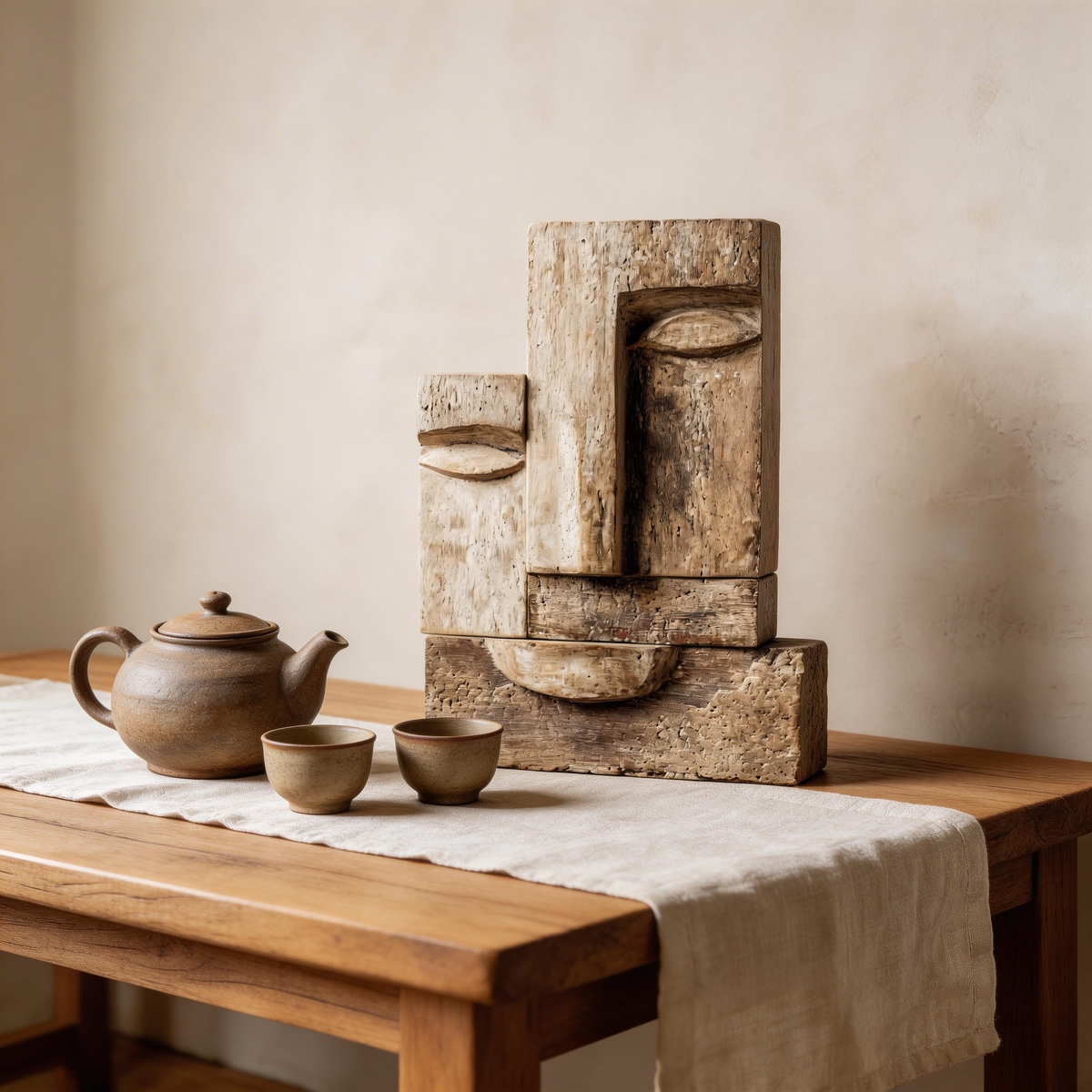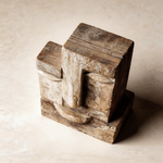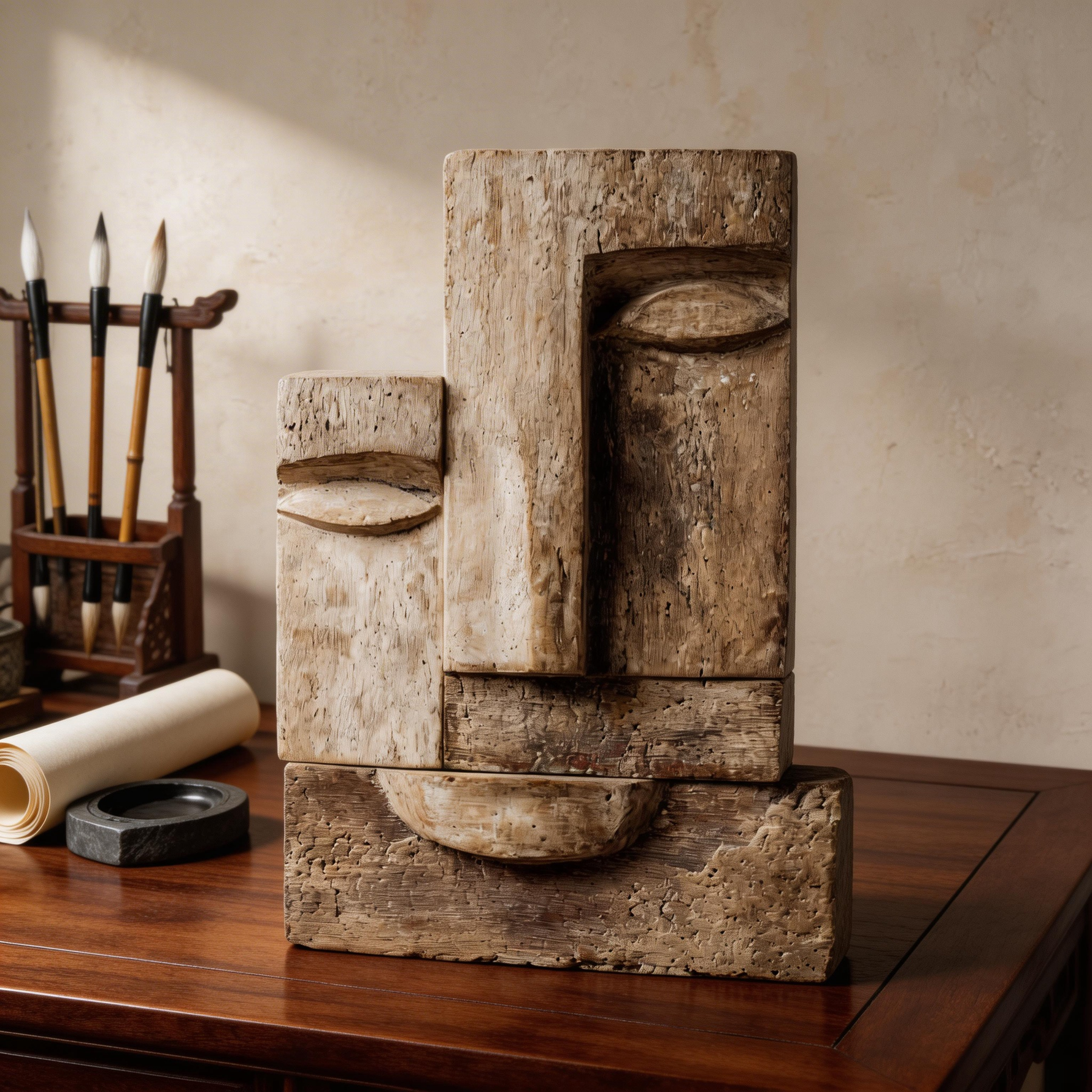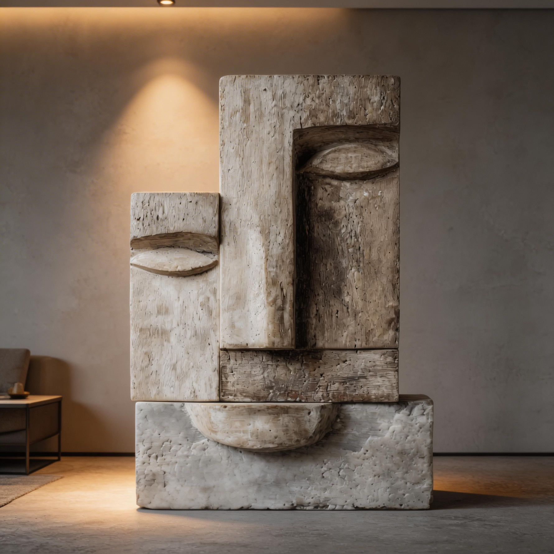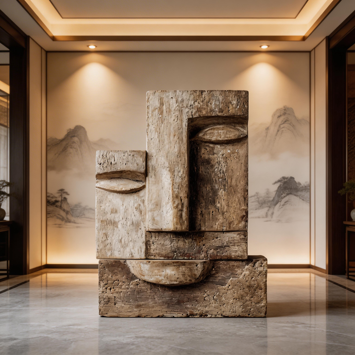 A striking abstract sculpture crafted from reclaimed wood, featuring a stacked, geometric composition of two overlapping faces. The weathered, textured finish reveals the raw, natural grain beneath, while the bold, blocky forms evoke themes of heritage, memory, and quiet introspection. A powerful centerpiece that bridges primitive craft and modern minimalism, ideal for elevating contemporary or wabi-sabi interiors.-