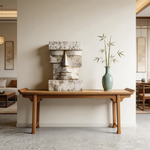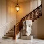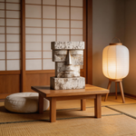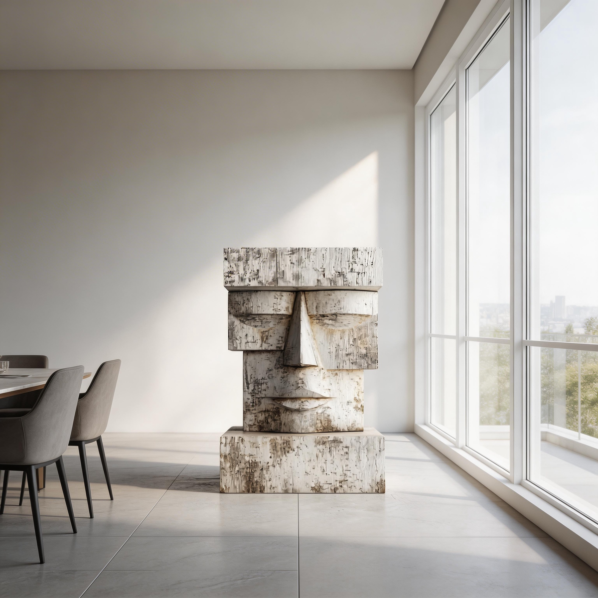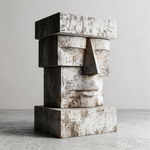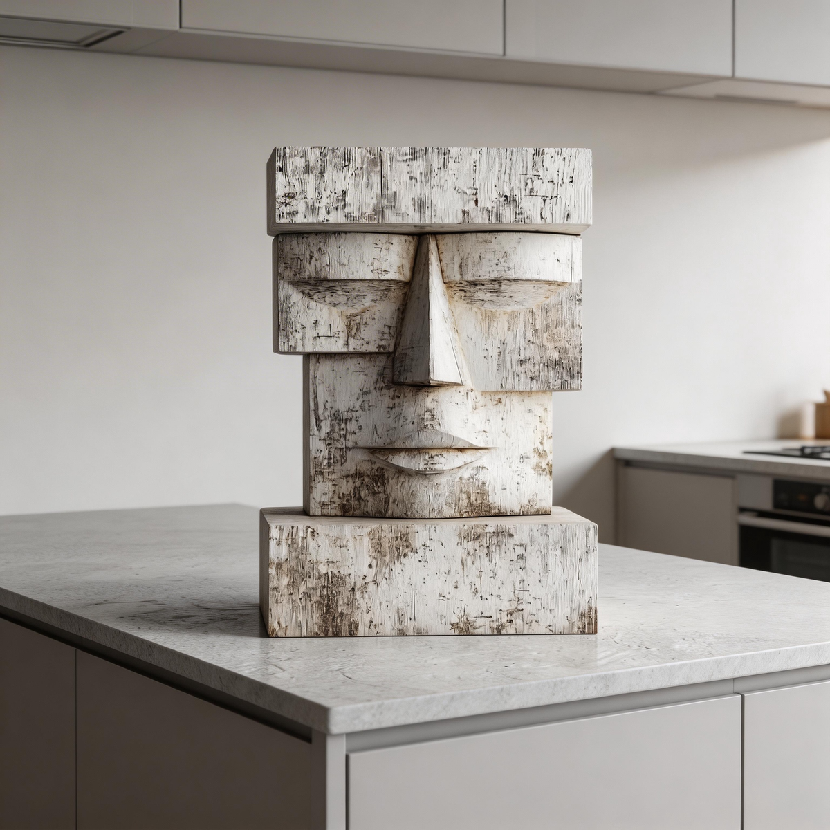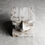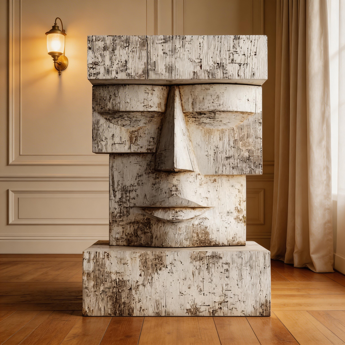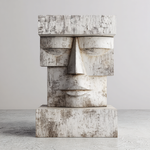 A striking geometric bust, carved from reclaimed wood and finished in a distressed white patina. Inspired by the timeless moai statues, its blocky, minimalist form and weathered texture evoke ancient wisdom and quiet strength—where the raw grain of aged timber meets the serene simplicity of closed eyes, creating a powerful connection to primal heritage and modern minimalism.-