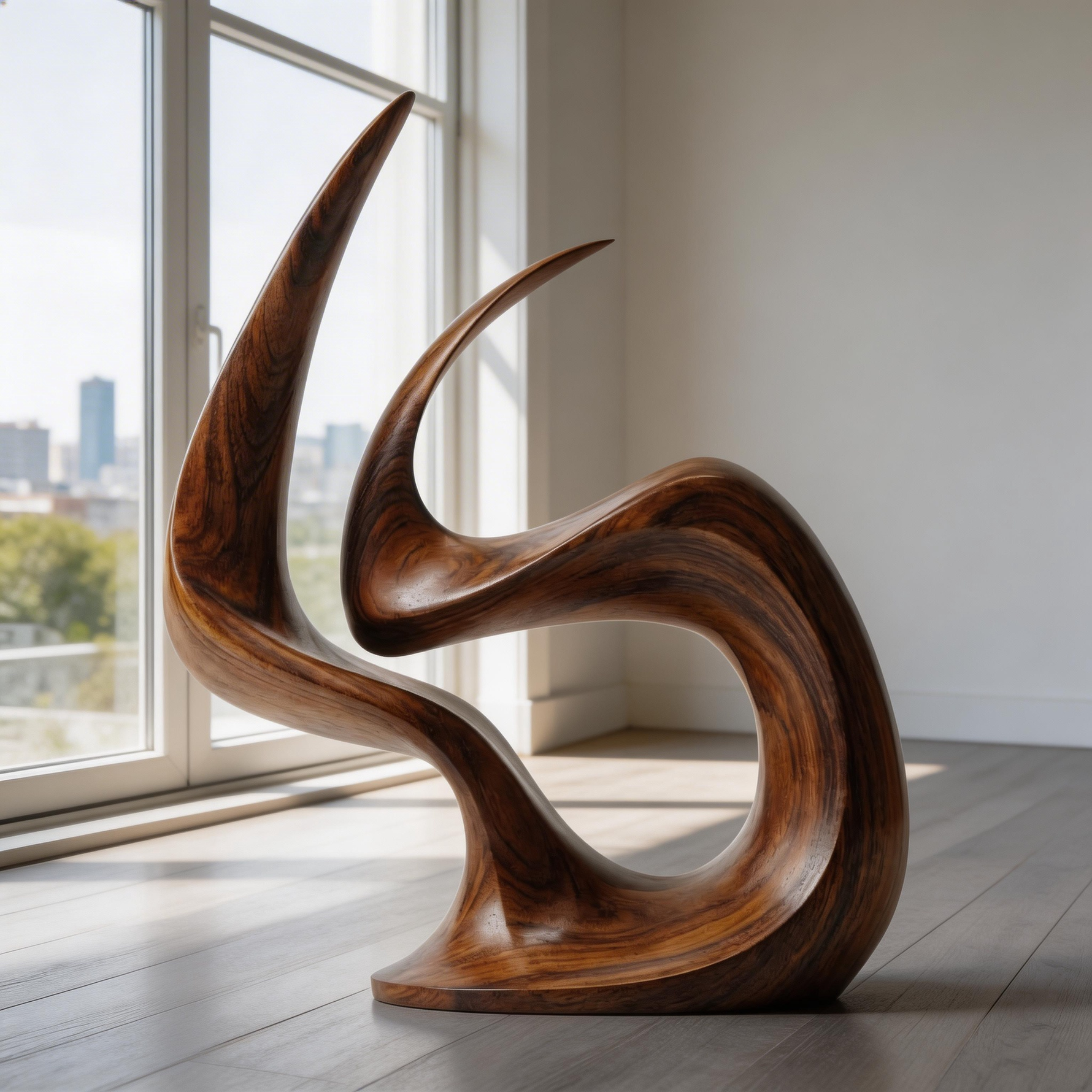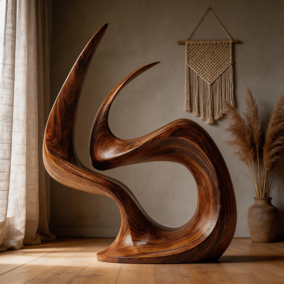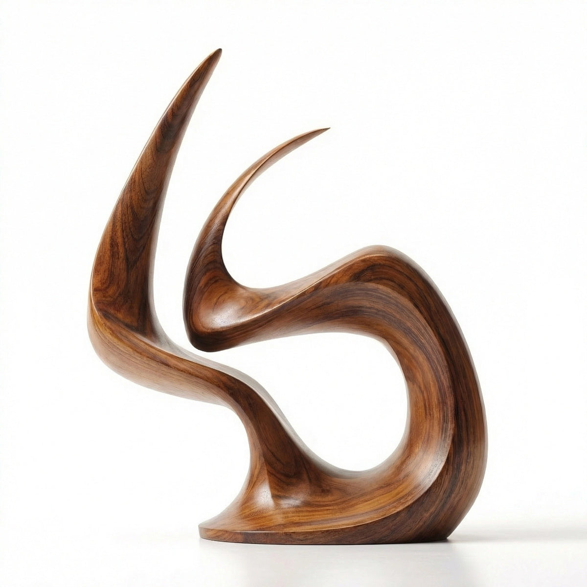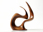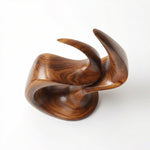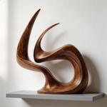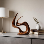 A hand-carved abstract wood sculpture capturing the dynamic form of an eternal flame, symbolizing passion, vitality, and everlasting warmth. Crafted from premium solid wood with a sleek, polished finish that highlights the natural grain, its fluid, continuous curves create dramatic shadow play, making it a striking centerpiece for modern interiors.-