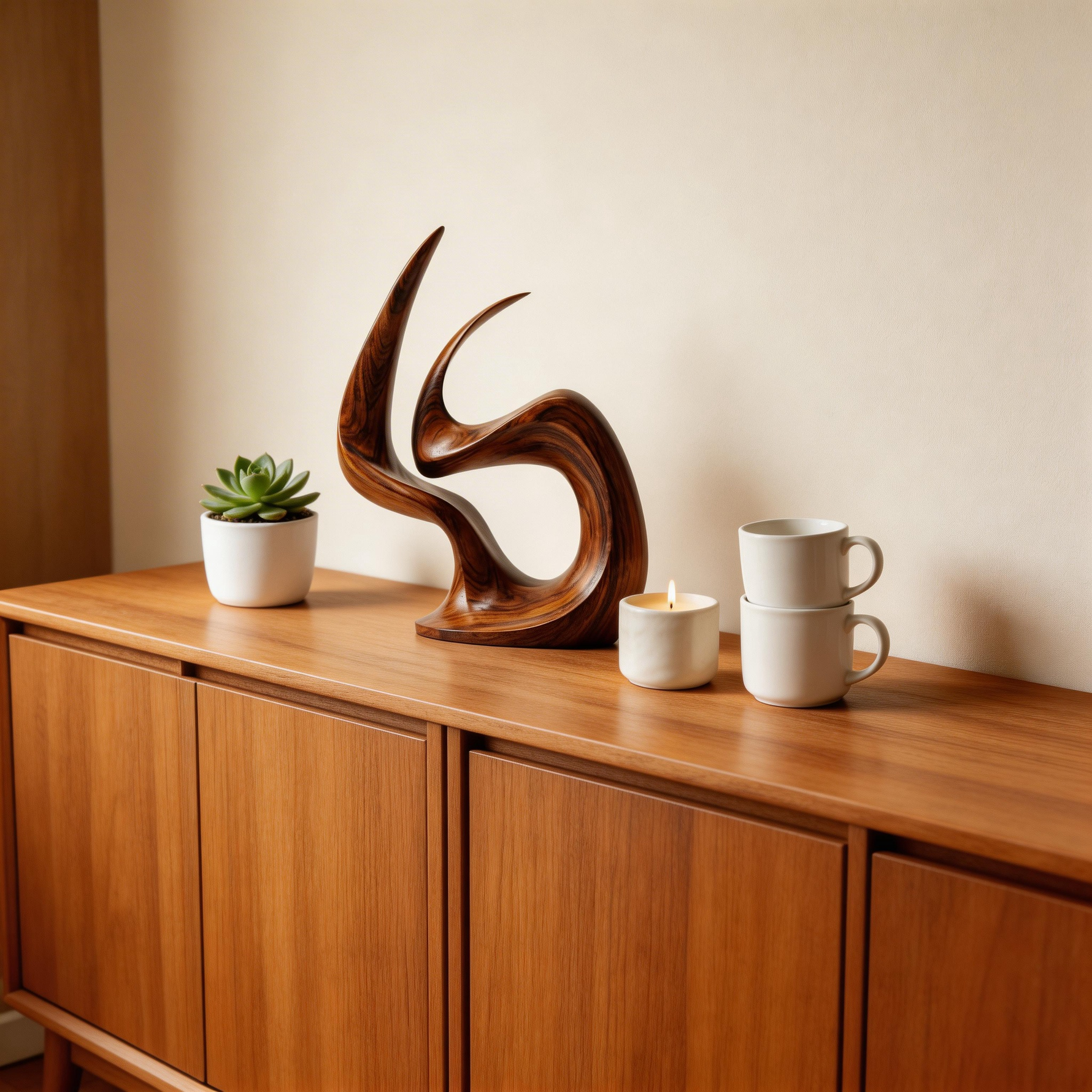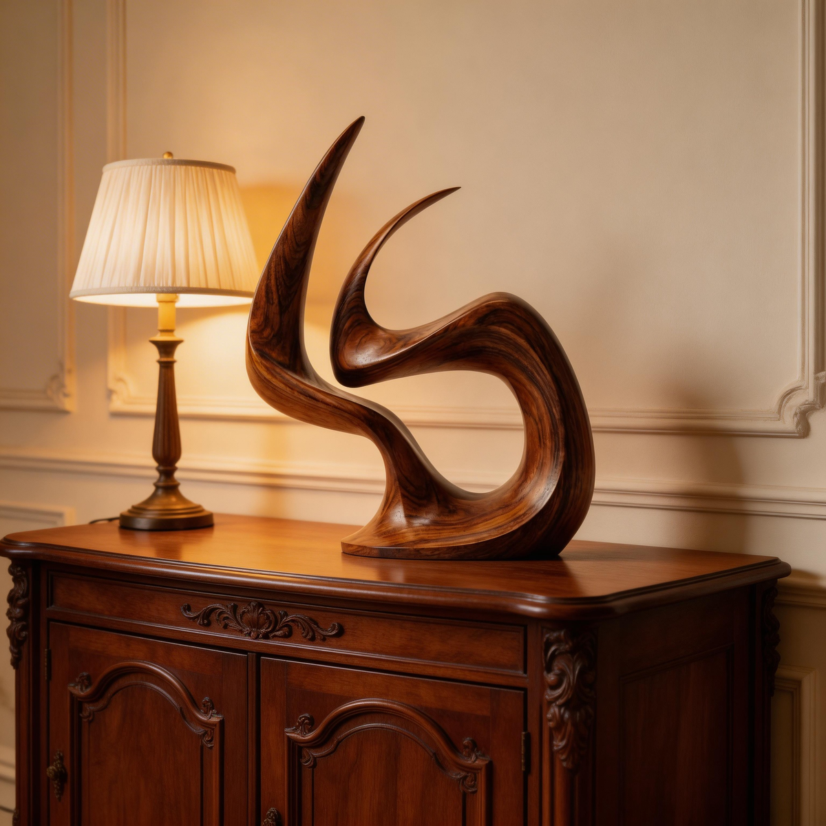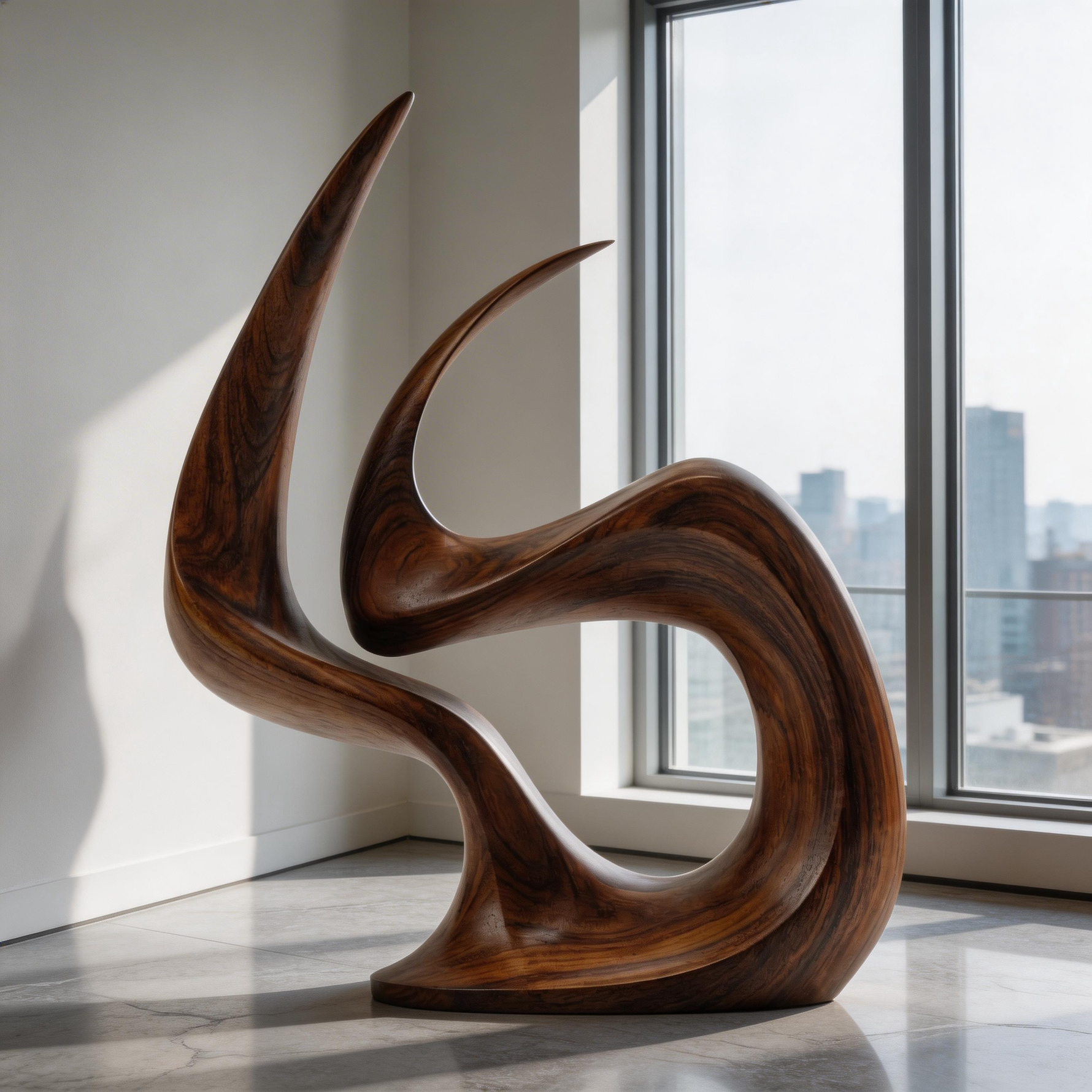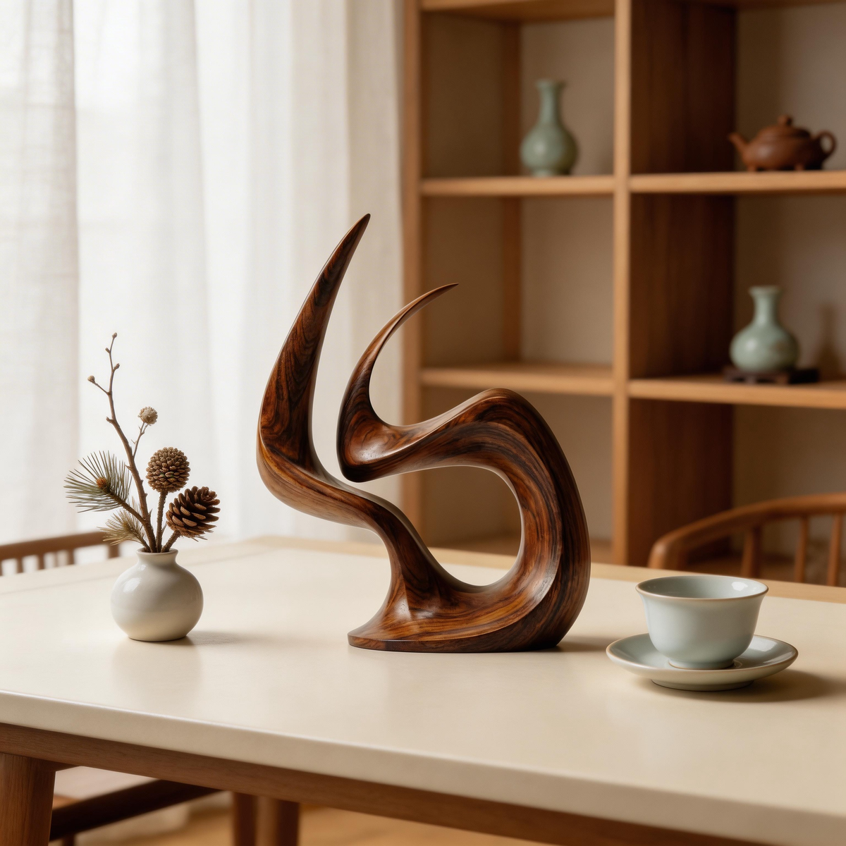 A hand-carved abstract wood sculpture capturing the dynamic form of an eternal flame, symbolizing passion, vitality, and everlasting warmth. Crafted from premium solid wood with a sleek, polished finish that highlights the natural grain, its fluid, continuous curves create dramatic shadow play, making it a striking centerpiece for modern interiors.-
